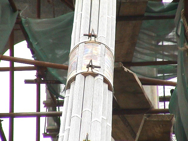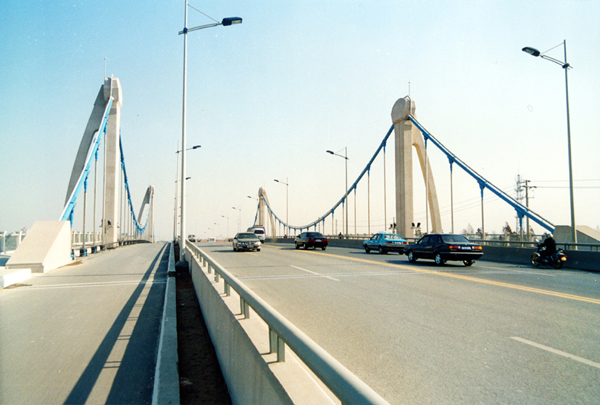 设计特点:①钢砼叠合主梁在自锚式悬索桥上的首次使用;②首次采用线型流畅的半弓形主塔(无横梁),构思巧妙、造型新颖;③小直径索夹在中小跨径桥梁上的成功运用;④首次采用临时锚碇的设计施工方案。⑤首次采用主缆无缠丝的防腐技术。