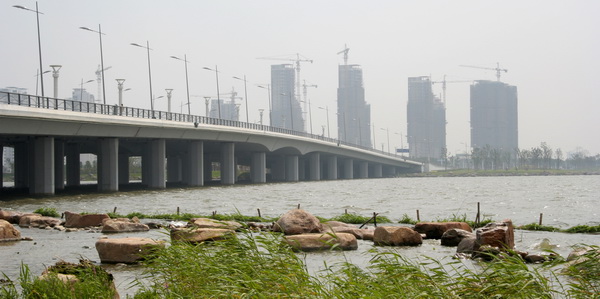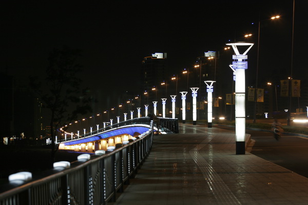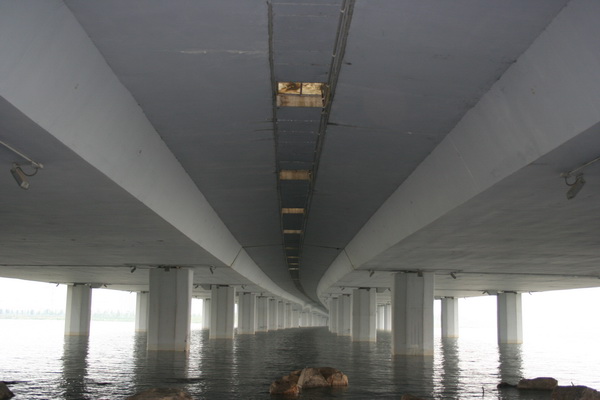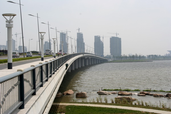 金鸡湖大桥选择合适的位置穿越金鸡湖水域,全桥位于半径为2800米的平曲线上,线形美观。大桥为六联三跨连续梁桥,主桥由35+45+35米一联组成,两侧引桥分别由3x30米两联和三联组成。桥梁全长565米,跨径均采用径向布置。由于桥梁横桥向较宽,在中央分隔带下设置1米采光通道,不仅使桥梁在横桥向成为2座独立的桥梁,并解决了桥下的采光问题。主桥上部结构采用预应力砼变截面连续箱梁,跨中及端部梁高1.6米墩顶梁高3.0米。箱梁断面型式为单箱多室,斜腹板。引桥采用预应力砼等截面连续箱梁,梁高1.6米,箱梁断面型式同主桥。主、引桥下部结构均采用钢筋砼柱式(棒槌形断面)桥墩,钻孔灌注桩基础。金鸡湖大桥的照明工程除满足道路照明设计要求外,还充分考虑了景观要求,使其成为“苏州工业园的一个夜间景观建筑”。 |