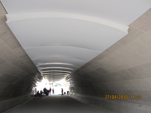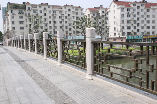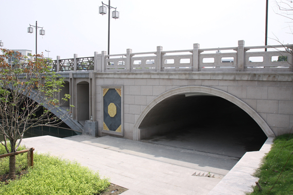 本桥为一孔净跨36米钢筋砼箱形拱桥,桥台台身内设人行通道沟通滨江人行通道,拱上设8个腹拱孔以减小拱桥自重。受周边路网、地块标高的限制,桥面标高基本与老桥持平,拱桥矢跨比为1/8.571。为了抵抗坦拱强大的水平推力, 桥台基础采用钻孔灌注桩基础,人行通道从桥台内部穿过。桥梁全长68米。桥梁全宽34米。 本桥为满足景观、文化要求,采用了温婉典雅的空腹式拱桥桥型。是在软土地基上建设拱式桥梁的有益尝试;本桥采用经典的空腹式拱桥配以庄重古朴的青石雕刻,积淀了千年的文化元素,无论何时都散发着江南水乡温婉浑厚的古典气质。桥台内嵌半月形拱门、外饰诗词楹联、富贵如意照壁,外观古色古香、温婉典雅。 |