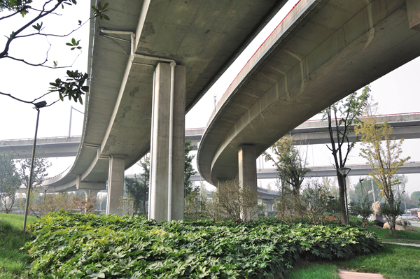 设计特点:分跨布置使桥梁结构合理、轻盈美观、行车舒适、造价经济,小半径的以25米跨径以下的钢筋混凝土梁为主,大半径的采用以30米以上跨径的预应力混凝土梁结构,下部结构大量采用独柱墩,仅在伸缩缝处设花瓶墩设双支座, 立交桥线形流畅,结构简洁,形态美观。 |