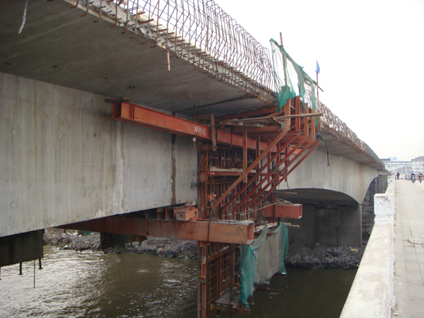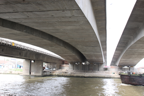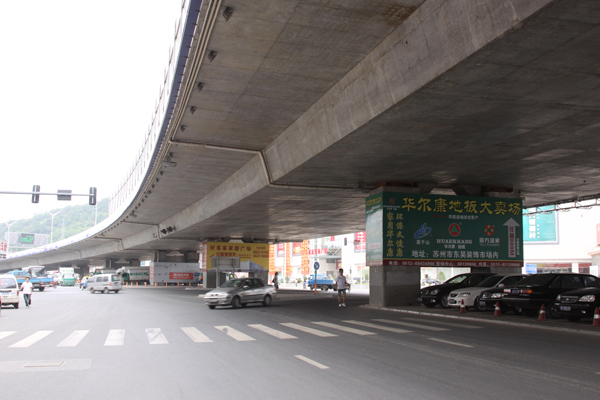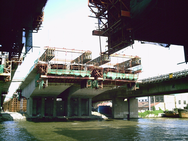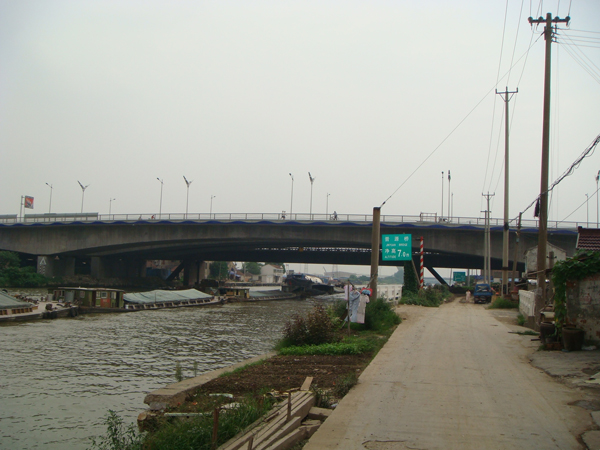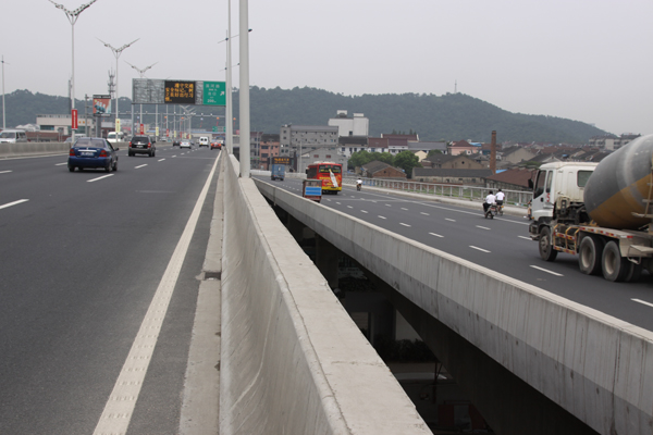 设计特点:平面线形连续、均衡,充分考虑二期工程的衔接。地面道路主要平叉口进行渠化设计,合理利用现有设施,地面道路跨京杭运河桥南线利用老晋源桥,节约工程投资。桥梁结构新颖,工艺先进,充分利用桥下空间,桥宽达26米,桥墩仅7米宽,横桥向大挑臂,高架桥下空间布置地面道路,7.5米中央分隔带作为停车场,满足横塘建材市场停车需要。跨京杭运河晋源桥采用挂蓝悬臂浇筑施工工艺,避免施工对航道的影响。沥青路面面层添加路用聚脂纤维材料,延长沥青路面的使用寿命。 |