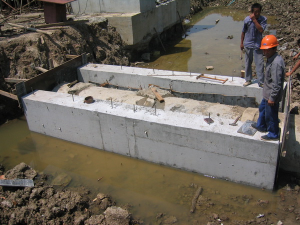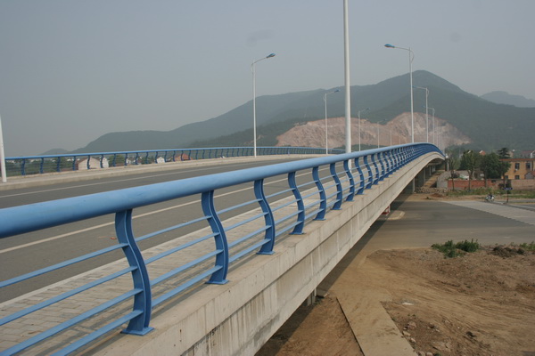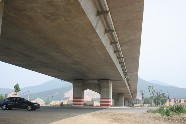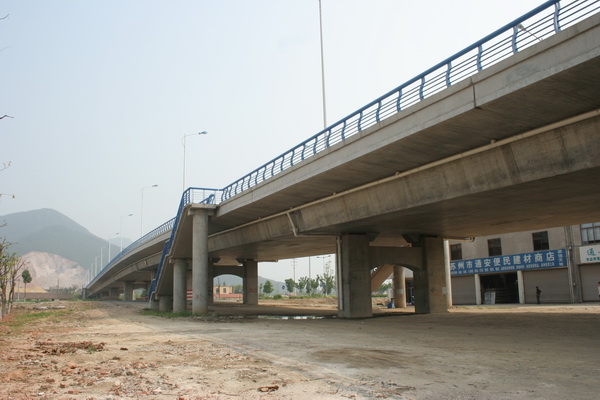 设计特点:①为四联单幅式单箱三室双向全预应力砼连续结构;②采用超静定结构,减少了跨中正弯矩,建筑高度较小;③钢束均通长布置在腹板内,有效地避免了应力集中现象;④一跨过河避免了水下作业,大大减小了施工难度;⑤桥北引坡设两条平行匝道与通浒大道互通;⑥桥南引坡设置半苜蓿叶形立交与兴贤路互通;