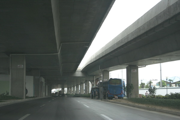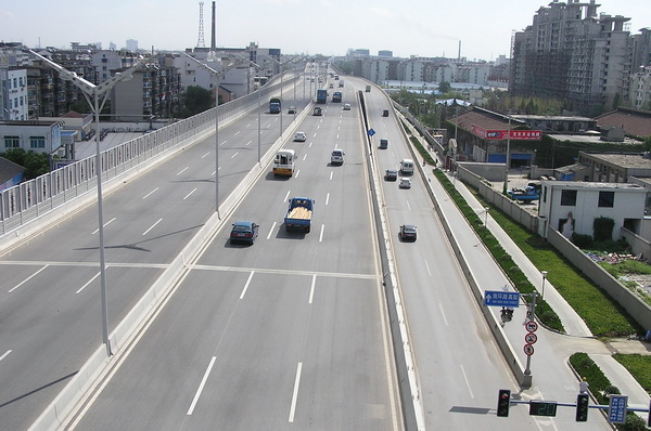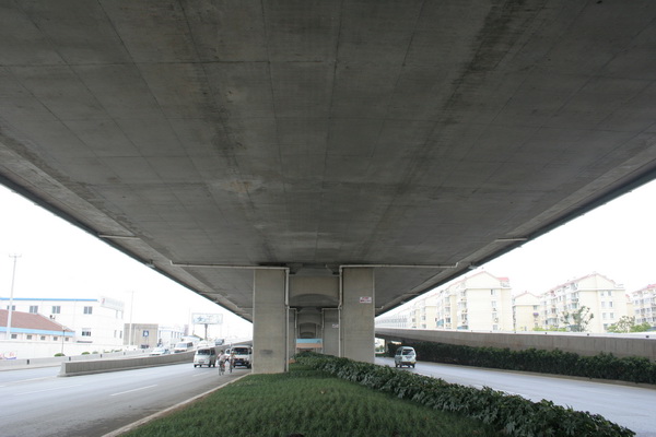高架桥梁以预应力现浇箱梁为主,跨越盘蠡路、西塘河、人民路、南园路等为30+45+30米连续箱梁,其余以32米跨径为主,有四跨一联和三跨一联等。桥梁横断面为大悬臂单箱三室斜腹板箱梁,梁底宽为16.2米,桥面板两边悬挑各4.90米,梁顶全宽为26.0米,等截面梁高2米, 桥面板和横梁均设置了强大的预应力,高架桥墩位置在地面道路中央分隔带宽度7.5米范围内,桥下空间为地面道路利用。高架桥桥面雨水通过桥墩两侧竖向泄水管排入地面雨水系统,雨、污水分流制。 |