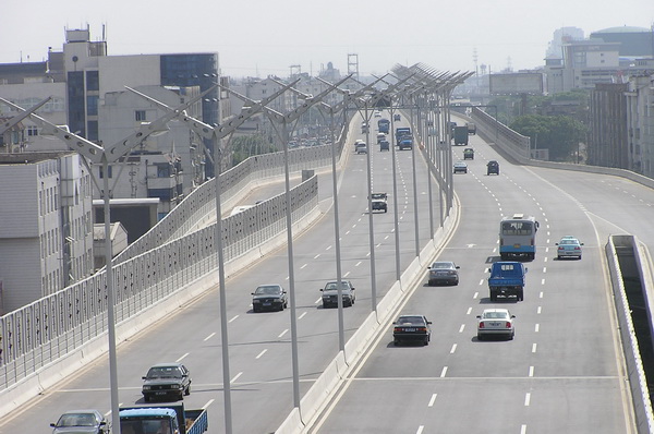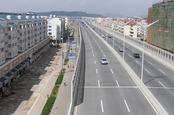 城市高架桥快速路,高架六车道,地面六车道,全长约4.5公里,正常段桥面宽26米,最宽处46米,包含六个上下匝道,高架桥面积约12.3万平方米, 预应力连续箱梁结构。