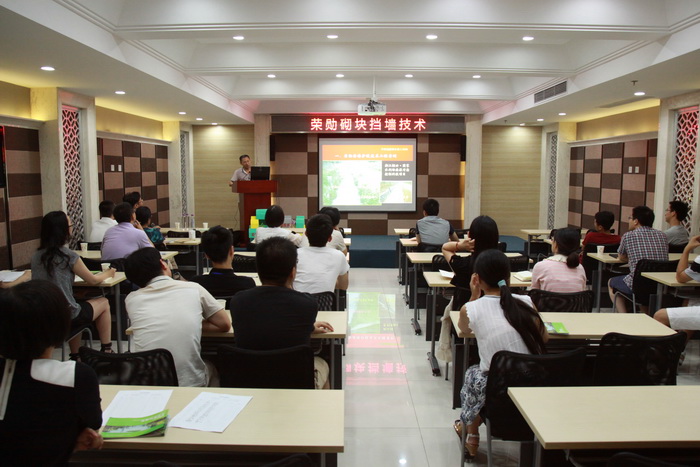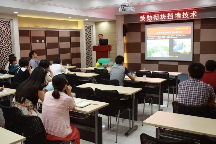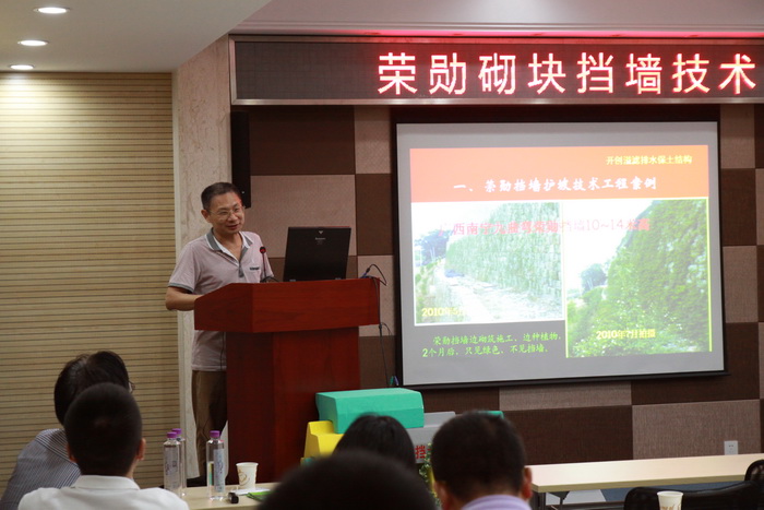 2015年7月28日下午,荣勋建材科技有限公司技术专家一行3人赴我司进行荣勋挡墙技术交流。荣勋挡墙技术发明者、国家标委会水泥制品生态分委员会委员汪荣勋先生以实际案例为载体,通过对比分析国内外行业技术,阐述了荣勋挡墙的溢排水、自挡土、自卡锁、自定位、生态化、花园化、人性化、景观化等特征优点,展示了挡土结构生态化的新理念、新思路。