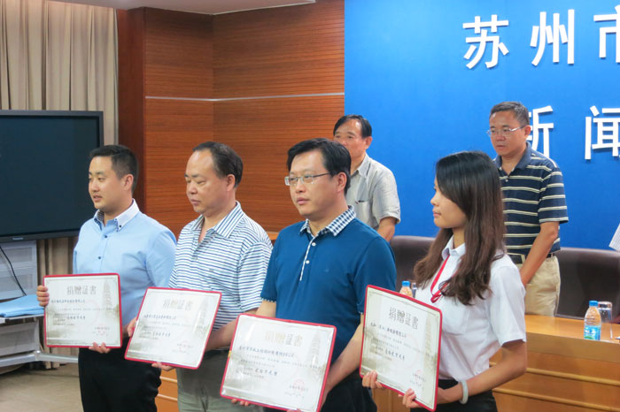 2013年7月26日下午,2013年度慈善助学新闻发布会在市政府新闻发布厅召开。市人大副主任、市慈善总会会长周玉龙,《姑苏晚报》副总编辑杨秉灏,市慈善总会(基金会)秘书长姜松春等领导及爱心捐赠企业负责人出席了新闻发布会。市民政局副局长、市慈善总会副会长、市慈善基金会副理事长郑利江主持新闻发布会。 发布会上,姜松春秘书长介绍了2013年慈善助学活动方案,爱心企业现场举牌捐赠,其中, 苏州市市政工程设计院有限责任公司捐款20万元,苏州路之遥科技股份有限公司捐款15万元,江苏奇力康皮肤药业有限公司捐款15万元,久知(吴江)新能源有限公司捐款12万元。今年的慈善助学活动再次扩大对贫困学生的资助范围,除继续考入高中(含中专)的新生一次性资助4000元/人,考入大学的新生一次性资助5000元/人外,首次将低保和低保边缘家庭研究生新生纳入资助范围,一次性资助6000元/人。周玉龙、郑利江、杨秉灏、姜松春等领导代表市慈善总会(基金会)接收捐赠,并为企业颁发捐赠证书。 |