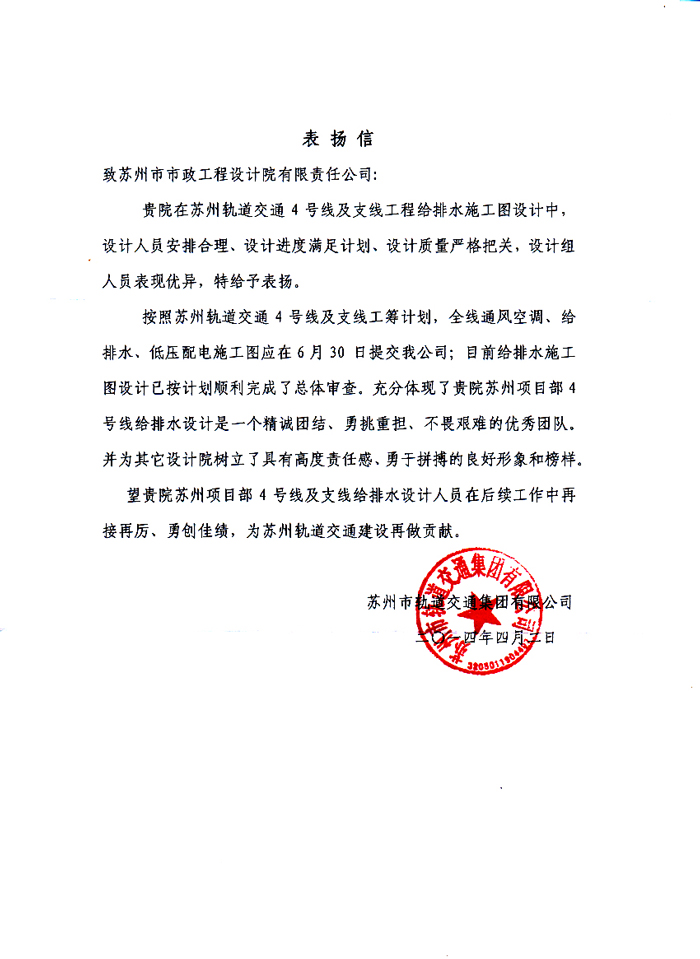 轨道公司对我公司苏州轨道交通4号线及支线工程给排水项目组的表扬信