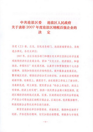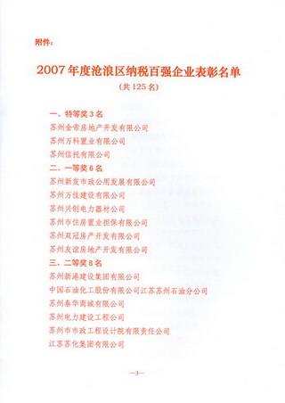 2008年2月1日,沧浪区委、区政府在苏州喜来登大酒店召开2007年度沧浪区纳税百强企业表彰大会,对2007年度纳税百强企业,楼宇经济、总部经济、品牌经济、服务业集聚区、科技创新先进单位进行了表彰。区委书记宋文辉,区委副书记、区长路军,区委副书记周建华,区人大常委会主任陈忆善,区政协主席李纪福及区委常委、区政府副区长、区人大、政协分管领导等出席大会。大会由副区长顾建平主持。