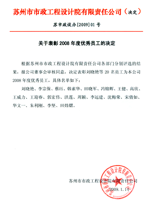 关于表彰2008年度优秀员工的决定