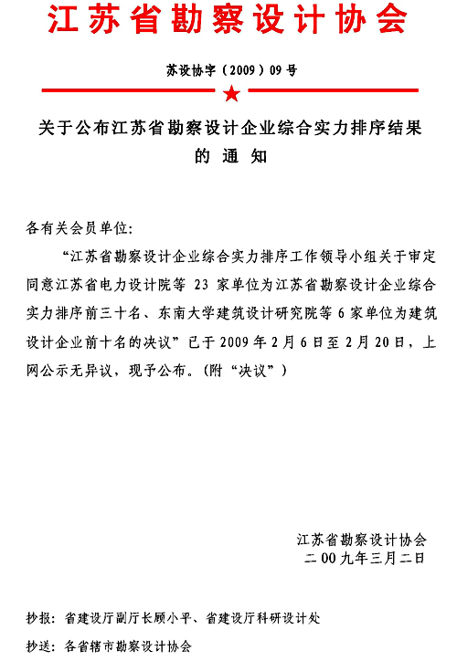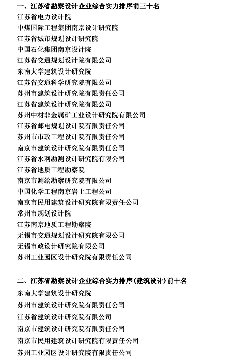 江苏省工程勘察设计企业综合实力排序审定结果,共有23家单位进入综合实力排序前30名,6家单位进入建筑设计企业前10名,我公司位列江苏省工程勘察设计企业综合实力排序第八名(江苏省所有市政设计院只有苏州无锡两院进入,我公司排在第一),苏州共有四家企业进入。