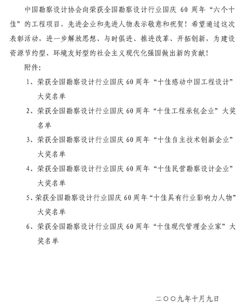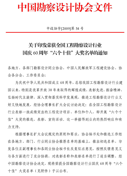 为庆祝中华人民共和国成立60周年,总结我国工程勘察设计行业建国以来、特别是改革开放30年来取得的辉煌成绩,表彰先进,振奋精神,弘扬时代主旋律,深入贯彻落实科学发展观,推进工程勘察设计行业又好又快地发展,中国勘察设计协会决定在全国工程勘察设计行业表彰一批成绩突出的工程设计项目、单位和个人,即开展“六个十佳”大奖的推选、表彰、宣传活动。