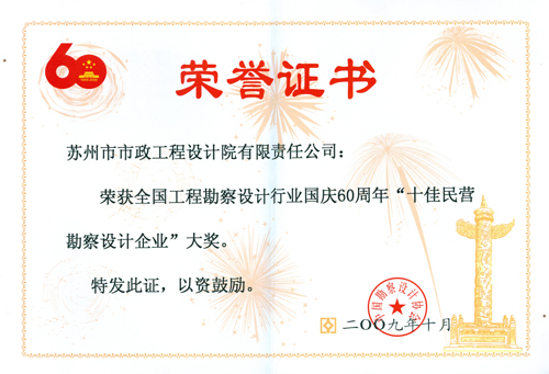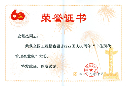 2009年10月28日,我公司董事长史佩杰赴北京参加国庆60周年“全国工程勘察设计行业表彰颁奖大会”。并领取全国“十佳民营勘查设计企业”大奖和个人“十佳现代管理企业家”大奖。