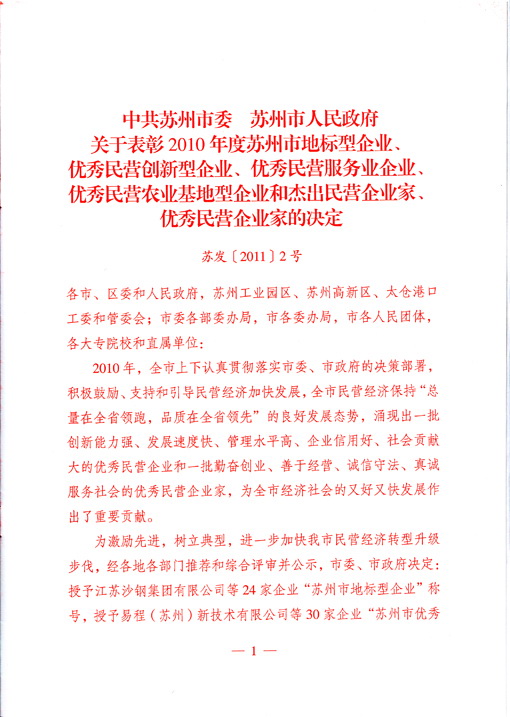 在2011年1月11日召开的苏州市全市民营经济工作会议上,我公司董事长史佩杰荣获“2010年度苏州市优秀民营企业家”表彰。