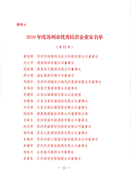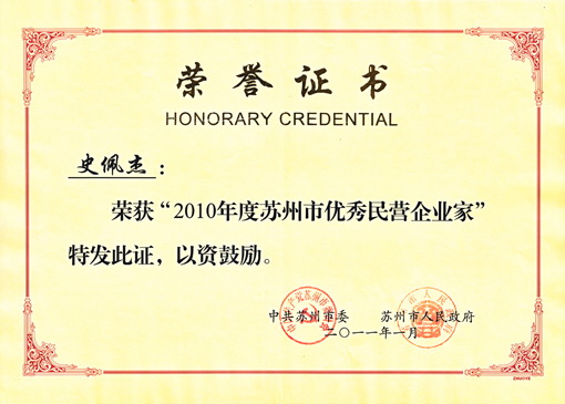 史佩杰董事长荣获“2010年度苏州市优秀民营企业家”表彰