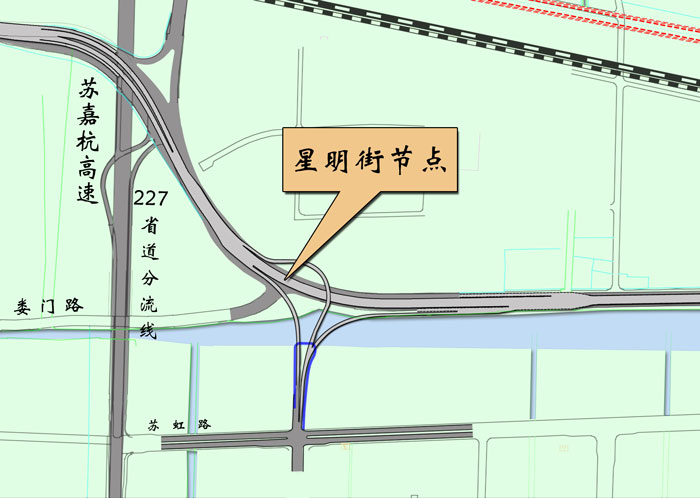 星明街自苏虹路交叉口以北起坡,节点范围内向北依次跨越娄江南规划道路、娄江、312国道,接入娄江快速路。节点为部分互通立交,共设置三个转向匝道、一对平行匝道,分别为南转西、西转南、南转东匝道,娄门路交叉口的一对出、入口匝道。