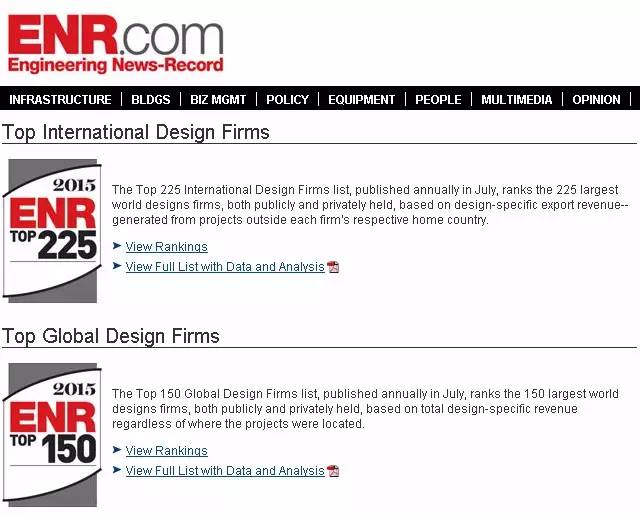 ENR“全球工程设计公司150强(The Top 150 Global Design Firms)”以设计企业的全球营业总收入为排名依据,重在体现设计企业的综合实力。“国际工程设计公司225强(The Top 225 International Design Firms)”的排名则依据设计企业在本土以外的海外工程业务总收入,重在体现设计企业的国际业务拓展实力。ENR榜单是国际工程界公认的、较为全面反映年度国际工程市场发展状况的权威排名,具有极高的权威性和广泛的影响力,堪比工程界的“《财富》世界500强排行榜”。
