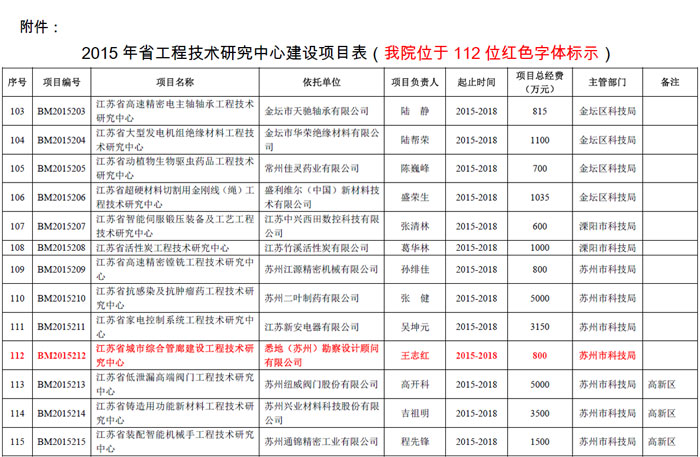 2015年12月,江苏省科学技术厅正式发文(苏科条发〔2015〕249号),为进一步推进省级企业研发机构建设,加快以企业为主体、市场为导向、产学研相结合的技术创新体系,经各省辖市科技主管部门推荐,省科技厅审定与公示,同意 “江苏省城市综合管廊建设工程技术研究中心” 的建立(以下简称“省级工程中心”)。