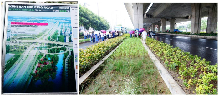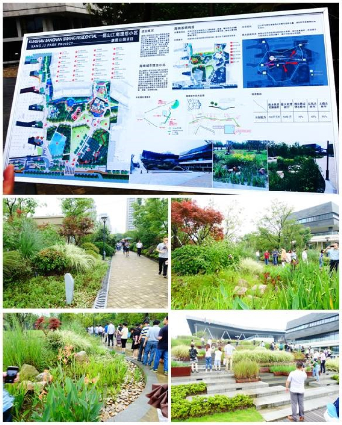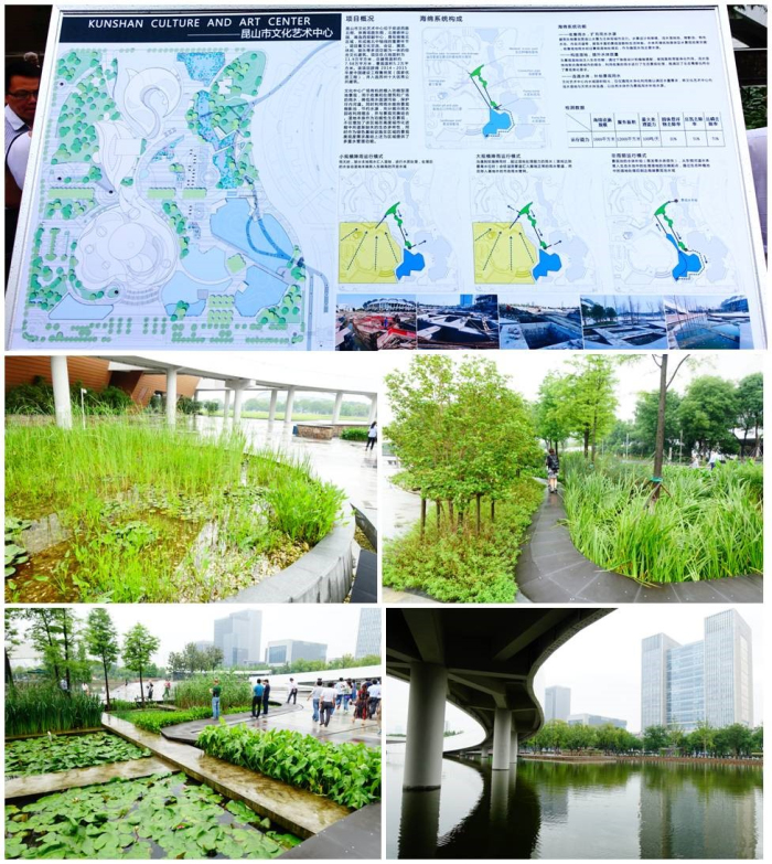与会专家实地参观考察了昆山市中环景观生态修复工程、昆山市文化艺术中心、康居公园、湖滨路等昆山海绵城市示范项目。