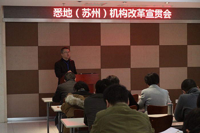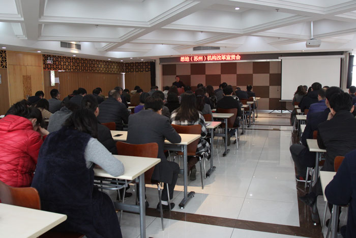12月15日下午,公司总裁史佩杰主持召开公司机构改革宣贯会,史总在会上向公司自然人股东、职代会代表及中层干部就本次机构改革方案进行了详细介绍并结合公司发展提出了本次改革的三个目标:1、搭设悉地(苏州)平台长效管理架构,实现管理扁平化的理念,提高企业管理效率;2、进一步实现管理层年轻化,让优秀的年轻干部承担更重要的责任;3、通过把所有业务部门全部纳入“事业合伙人业务团队”管理模式,容纳更多的投资主体,明晰利益机制,适应市场环境,激发业务动力。