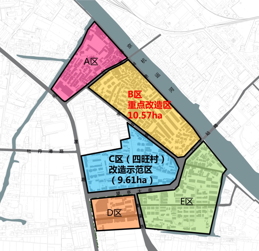 E区:紧邻京杭运河,地块内以住宅建筑为主,有可利用空间,可按照城市发展需求加以盘活利用。
