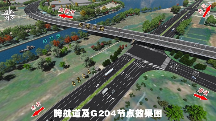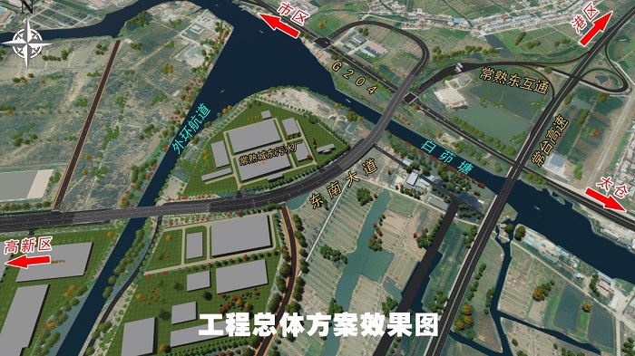 本项目西起玉山路交叉口西,向东跨越外环航道后落地,与规划道路T形交叉,继续上跨白茆塘和G204后落地,利用U型回转与G204相接。随着本项目建设,通过东南大道直接与常台高速相连,加快与张家港、上海、南通等周边区域的沟通,同时为常熟高新区东部片区城市发展、土地开发提供交通支撑及服务通道。