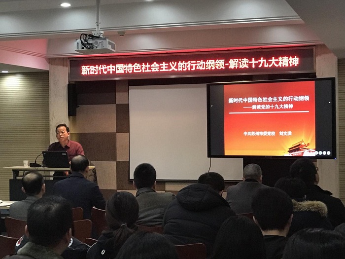 1月24日,悉地(苏州)特邀中共苏州市委党校刘文洪校长作题为“新时代中国特色社会主义行动纲领-解读党的十九大精神”的专题宣讲,公司领导、各部门职员、党员积极到场聆听参与。