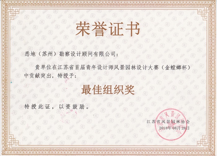 2018年被评为首届青年设计师风景园林设计大赛(金螳螂杯)中贡献突出,授予最佳组织奖。
