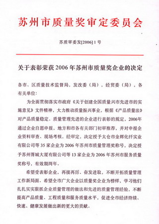 我公司荣获2006年苏州市服务质量奖称号。