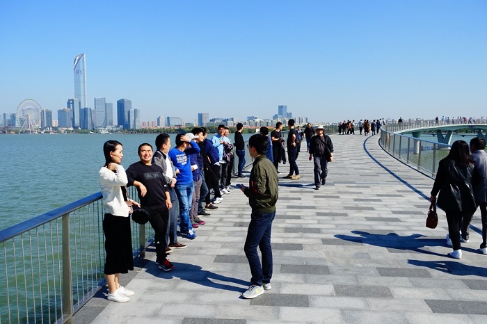 大家在宽敞的步道上徒步健身的同时,又增进了友谊,触发了灵感,领略了金鸡湖美景,同时对公司承担设计的项目也感到无比的自豪。