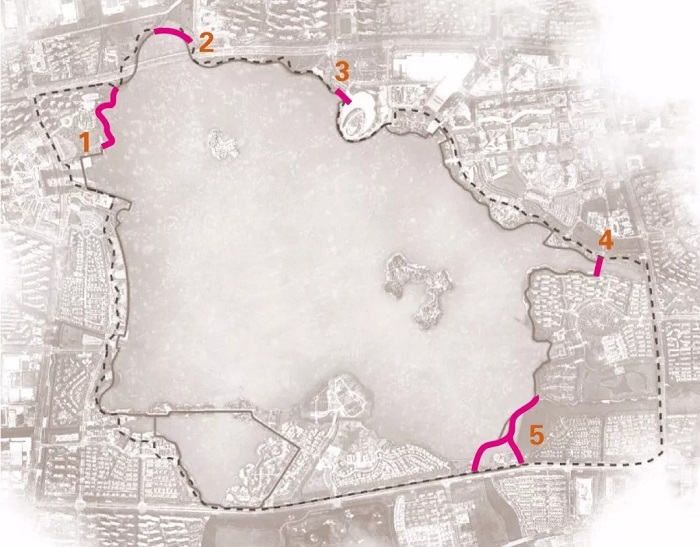 本工程新建及拓宽的步道宽以4~6米为主,铺面以花岗岩为主,沿途设置城市家具等配套设施,围绕新建、改建的步道进行绿化提升改造。步道全长14公里,步行一圈2.5-3小时。
