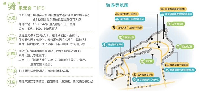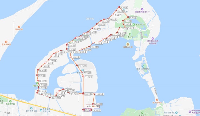 骑行路线:阳澄湖半岛旅游度假区——阳澄环路——水芙路——潭溪路——水泽路——临湖自行车道——莲池湖公园——临湖自行车道——阳澄环路——水芙路——阳澄湖半岛旅游度假区,总长约16公里。