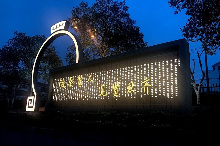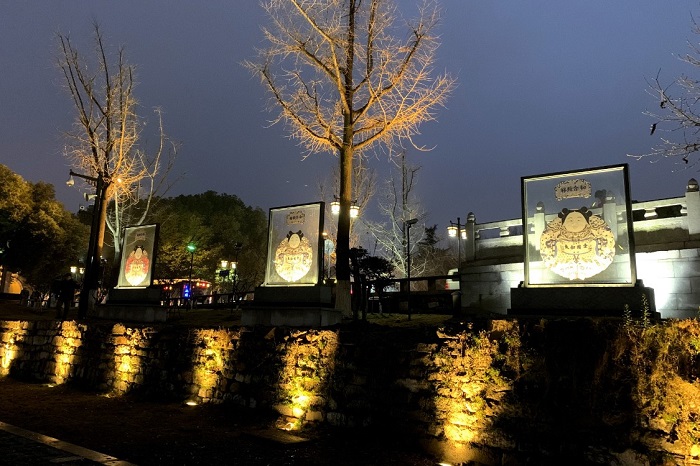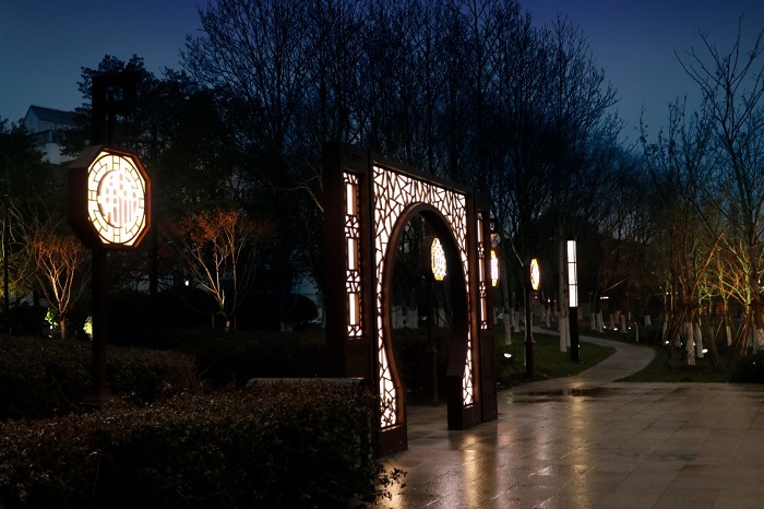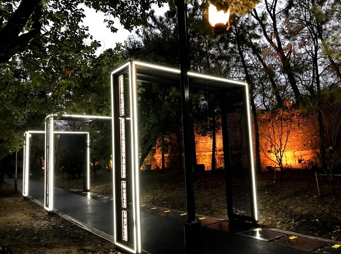 漫步在新市桥南侧健身步道沿线上,一组御窑金砖映入眼帘:灯光线条勾勒出金砖形态,简单干净;金属板材犹如金砖一样,敲击出金属声音;砖上的刻印,是历史的鉴证,承载着制砖人的智慧与成果。