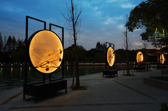 中国哲学中有一个著名比喻:“月印万川、处处皆圆”,圆即圆满。位于蟠龙桥西南侧的“新苏雅韵”,用纯黑色几何形金属架搭配象征“月印万川”的大圆盘,在每个圆盘上分别点缀着代表苏州韵味的事物。