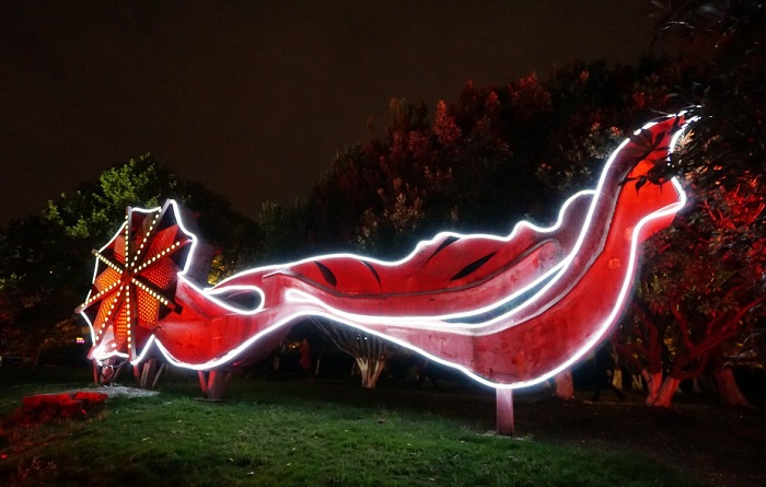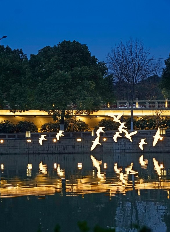 坐落在干将桥西南侧滨水平台上的一组苏式花窗灯光雕塑小品,融合了苏州园林中月洞门、花窗格、漏窗等艺术特点,再搭配灯光照影,既满足了日间观赏,当夜间灯光亮起时,又将苏式花窗的精美细致表现得淋漓尽致。白鹭野趣