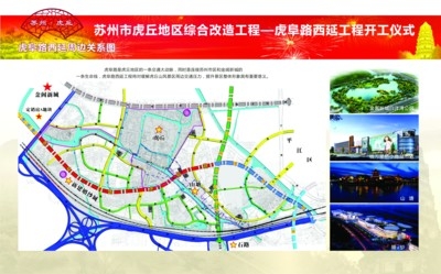 出席开工仪式。虎丘地区综合改造工程建设指挥部总指挥、副市长徐惠民主持开工仪式。 虎丘是苏州古城的象征,也是苏州文明的标志。然而,由于受客观条件限制,虎丘地区的城市形态、功能配套相对滞后,与苏州整体形象不相适应。为彻底改变这一状况,去年4月份,虎丘地区综合改造工程正式启动,揭开了千年虎丘“华丽转身”的序幕。一年来,虎丘综改取得了良好成效:虎丘景区详规等“七大规划”全部进入完善报批阶段,“虎丘周边地区综合改造”等四项规划已获批准; 首期启动区拆迁进度已达91%,虎阜路西延西段的征收进度已达95%,新建婚纱城、虎金路等地块已完成评估量的96%;同时,开工建设小学、幼儿园等配套设施,定销房A地块南区15栋住宅楼已结顶,北区桩基工程已启动,B地块也将挂拍。 现有虎阜路是条断头路,这不仅使金阊新城与古城交通无法顺畅沟通,也给周边居民的生活带来了不便。为加快完善虎丘地区的基础设施,优化虎丘地区的交通环境,此次正式启动虎阜路西延工程。据悉,虎阜路西延道路西起苏虞张连接线一期高架桥下的新园路,东接清塘西路,是连接主城区与虎丘地区的重要通道。道路全长2410米,路幅宽40米,6车道。道路沿线拟建1座跨越齐白河桥梁,3座跨越青龙河桥梁,拆除重建现有虎阜大桥,以及雨污水管道、照明工程等附属设施,道路等级为城市2级主干道,工程总投资9.9亿元人民币。整个工程预计2012年底竣工。金阊区有关人士称,该项工程的实施,标志着虎丘地区综合改造已经跨入拆建并举、破立并行的新阶段,同时,此举对于打通新城与古城的交通主动脉,带动金阊乃至中心城区的发展,也将起到积极的促进作用。
