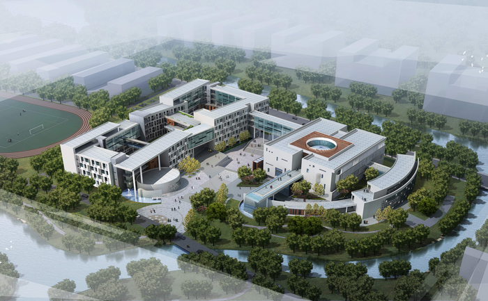 该项目位于国际教育园苏州市职业大学北区中部预留建设用地区域。本次设计场地北侧为学校生活区,南侧及西南侧为已建教学楼,东侧为教育园内部道路。基地3面还路,沿基地西南侧有一河道流经,河道西侧相邻几片绿地景观,坏境优美。