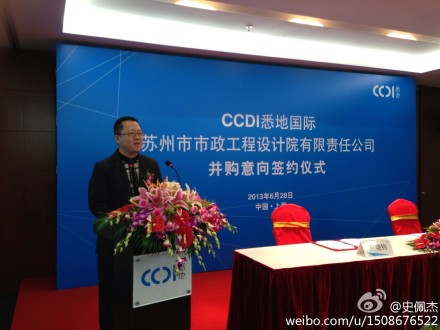 2013年6月28日,CCDI与苏州市市政工程设计院有限责任公司并购意向签约仪式在上海总部隆重举行。CCDI董事长兼总经理赵晓钧、苏州市政院董事长史佩杰、双方公司管理层代表CCDI副总经理张泰一、苏州市政院董事兼总裁钱劭彦、江苏省勘察设计行业协会理事长陆根法、上海市勘察设计行业协会秘书长邢国伟、天强(中国)管理顾问有限公司总经理祝波善、苏州市住房和城乡建设局副局长邱晓翔、苏州市住房和城乡建设局规划设计处处长陈实等相关协会、政府主管部门代表及行业专家、媒体共同参加了仪式。 此次仪式由张泰一主持。会议伊始先播放了双方公司的介绍视频。赵晓钧、史佩杰分别就双方并购意向及未来发展方向作了发言,邢国伟、祝波善、陆根法先后致贺词。随后,赵晓钧、史佩杰共同签署并购股权转让意向书并共同打开香槟庆祝。仪式结束后,赵晓钧、史佩杰接受了相关媒体的采访。 苏州市政院在不断发展中成为一家拥有十个甲级设计资质的大型综合设计企业,下设“市政交通设计院、建筑规划设计院、景观园林设计院、勘察及岩土工程设计院”四大专业设计院,并在全国各地设立众多分支机构开展勘察设计业务。苏州市政院专注城市建设的设计咨询服务,业务涵盖众多专业领域,近年来,完成了包括苏州工业园区市政工程设计在内的大量高水准的市政、交通、建筑、景观、轨道交通等工程的勘察设计及咨询任务。 此次并购意向的签署将有助于推进CCDI资源优势、品牌优势与苏州市政院技术服务优势的融合,通过优势互补使双方在更高层次、更宽领域里实现双赢。
