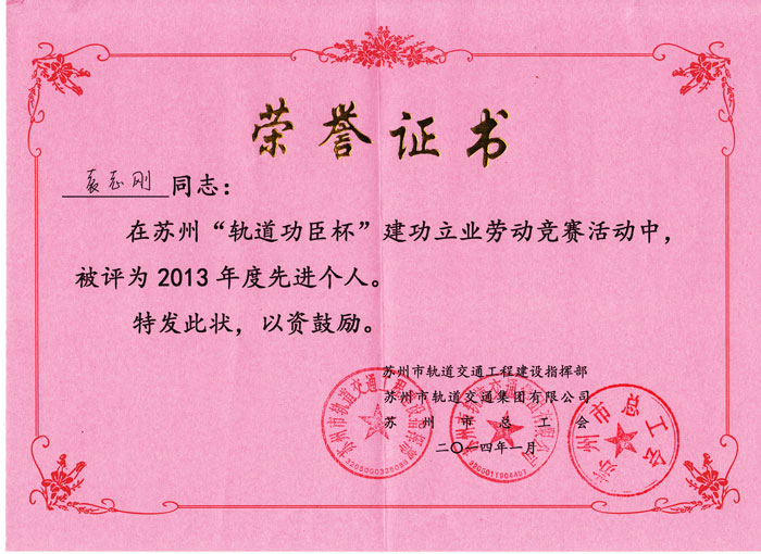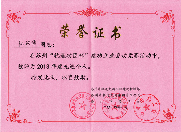 公司荣获2013年度“轨道功臣杯”劳动竞赛的优胜单位表彰。陆敏博、袁志刚两位同志荣获2013年度“轨道功臣杯”劳动竞赛先进个人表彰。