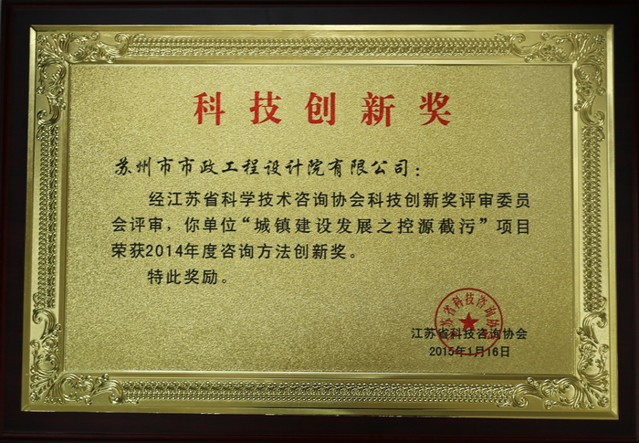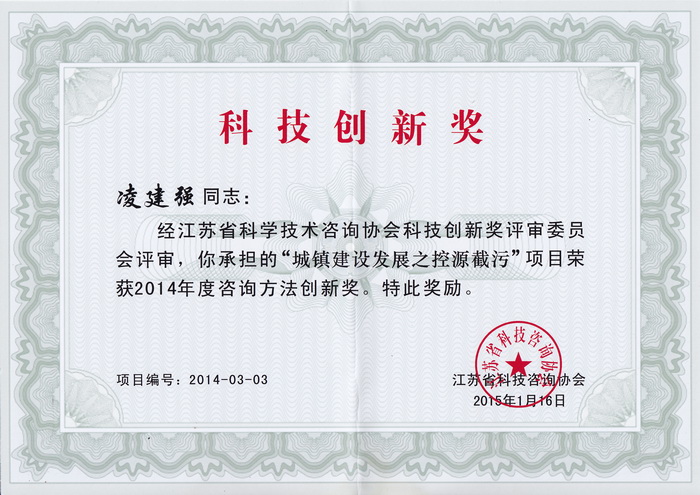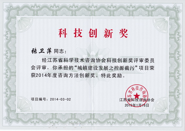 大会向获得首届“江苏省协会科技咨询协会科技创新奖”和“协会成立20周年纪念活动优秀论文”奖的企业和个人进行颁奖。经评审委员会评审,我司王志红、张卫萍、凌建强承担的“城镇建设发展之控源截污”项目获2014年度咨询方法创新奖,我司曾惠芬被授予2014年度咨询创新英才奖。